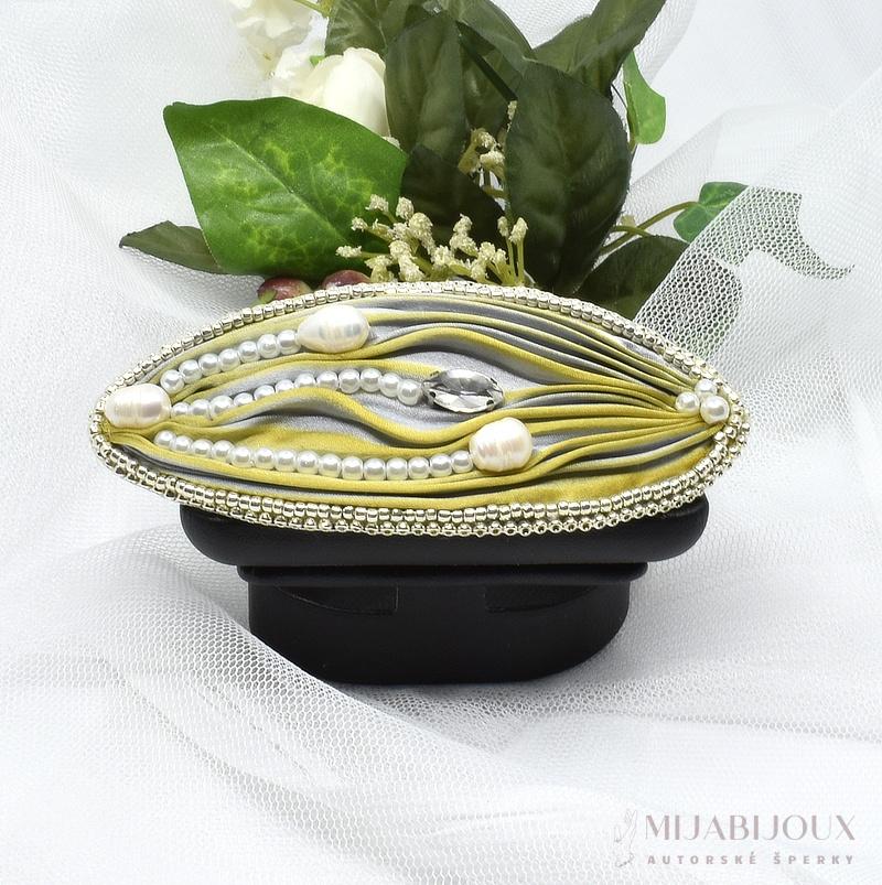 Luxusní spona do vlasů s originální hedvábnou stuhou "shibori ribbon" (ručně malované hedvábí), pravými říčním perlami, skleněnými perličkami a našívacím šatonem.