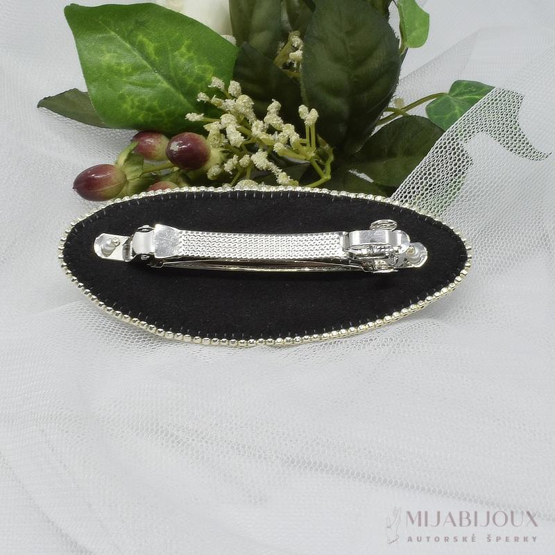 Základ je vyšitý na pevné plsti, která je začištěná umělou semiší Alcantara na kterou je pomocí korálků připevněný mechanismus francouzského zapínání.