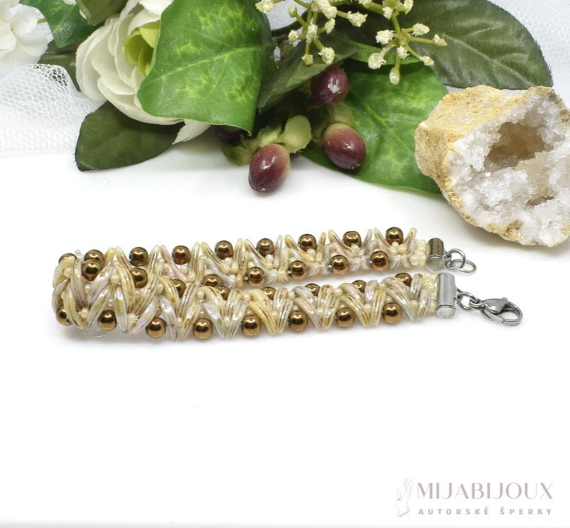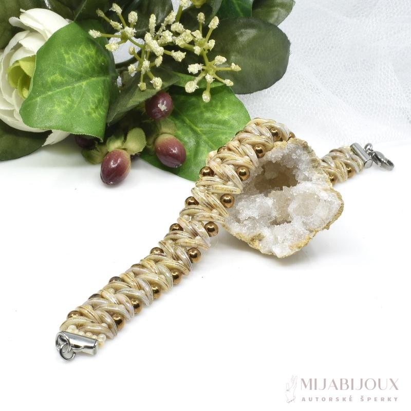 Tento ručně šitý korálkový náramek je vyroben s použitím jedinečné techniky beadingu, která kombinuje půvabné korálky typu crescent, jemné rokajlové korálky a elegantní kulaté hnědé korálky s kovovým vzhledem o průměru 3 mm. Díky kombinaci tvarů a textur vytváří náramek zajímavý vzor, který vypadá skvěle jak k formálnímu oblečení, tak i ležérnímu oblečení. Tento stylový náramek je ideálním doplňkem pro ty, kdo ocení ruční práci a jedinečnost.
