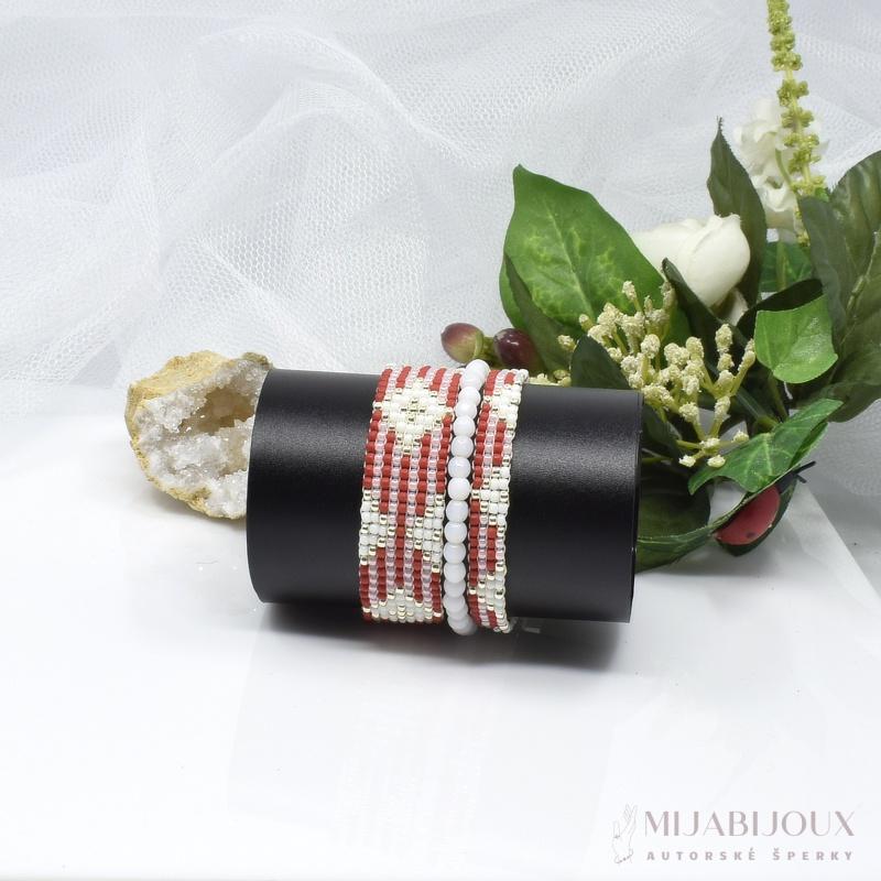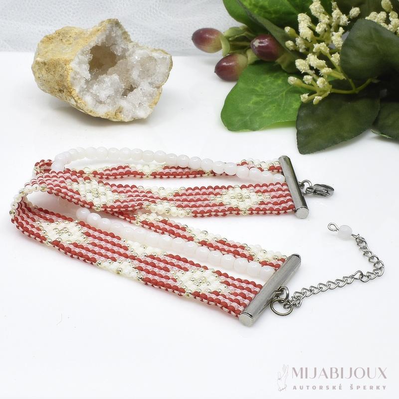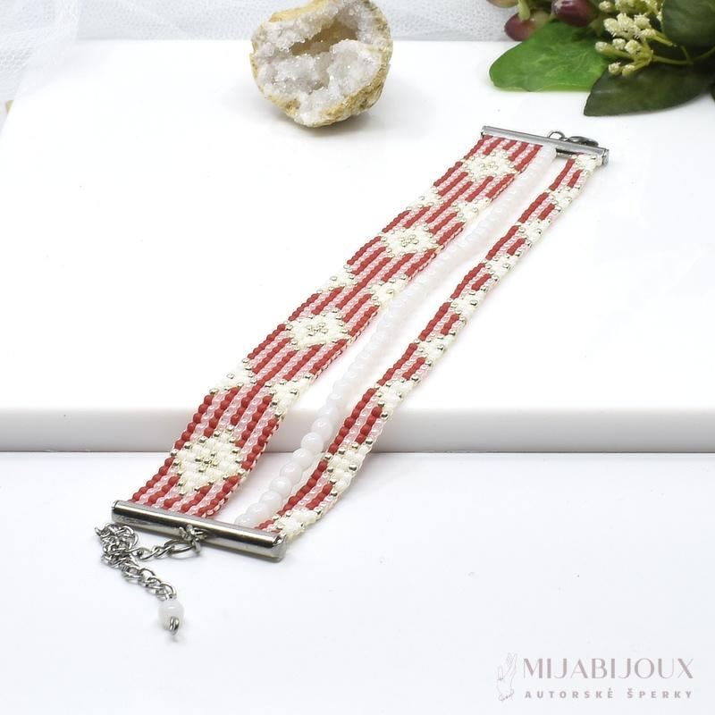 Víceřadý náramek ručně vyrobený z japonského rokajlu Toho round, precizně zpracovaný technikou square stitch. Na náramek je použitý rokajl v barvě červené, bílé a zlaté. Do designu jsou zakomponovány i bílé skleněné korálky, náramku nádech klasické elegance. Korálky jsou vloženy mezi řady proužků z rokajlu, což vytváří vizuálně zajímavý efekt a náramek tak působí zároveň bohatě a luxusně.