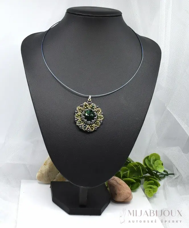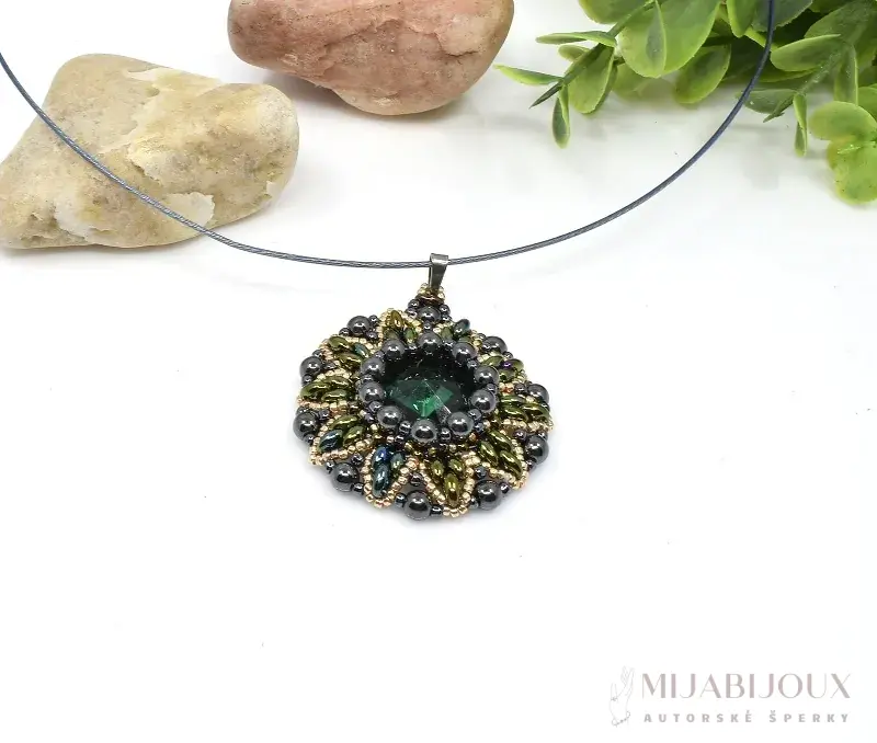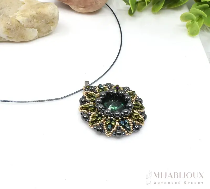 Originální přívěsek připomínající hvězdu. Barevná kombinace tmavě zelené matubo rivoli, hematitu a japonských Toho korálků ve zlatém provedení je dokonalou kombinací elegance a jemnosti. Zelená broušená rivoli, která je obšitá hematitovými korálky, dvoudírkovými korálky SuperDuo a zlatý rokajl tvoří dokonalý soulad.